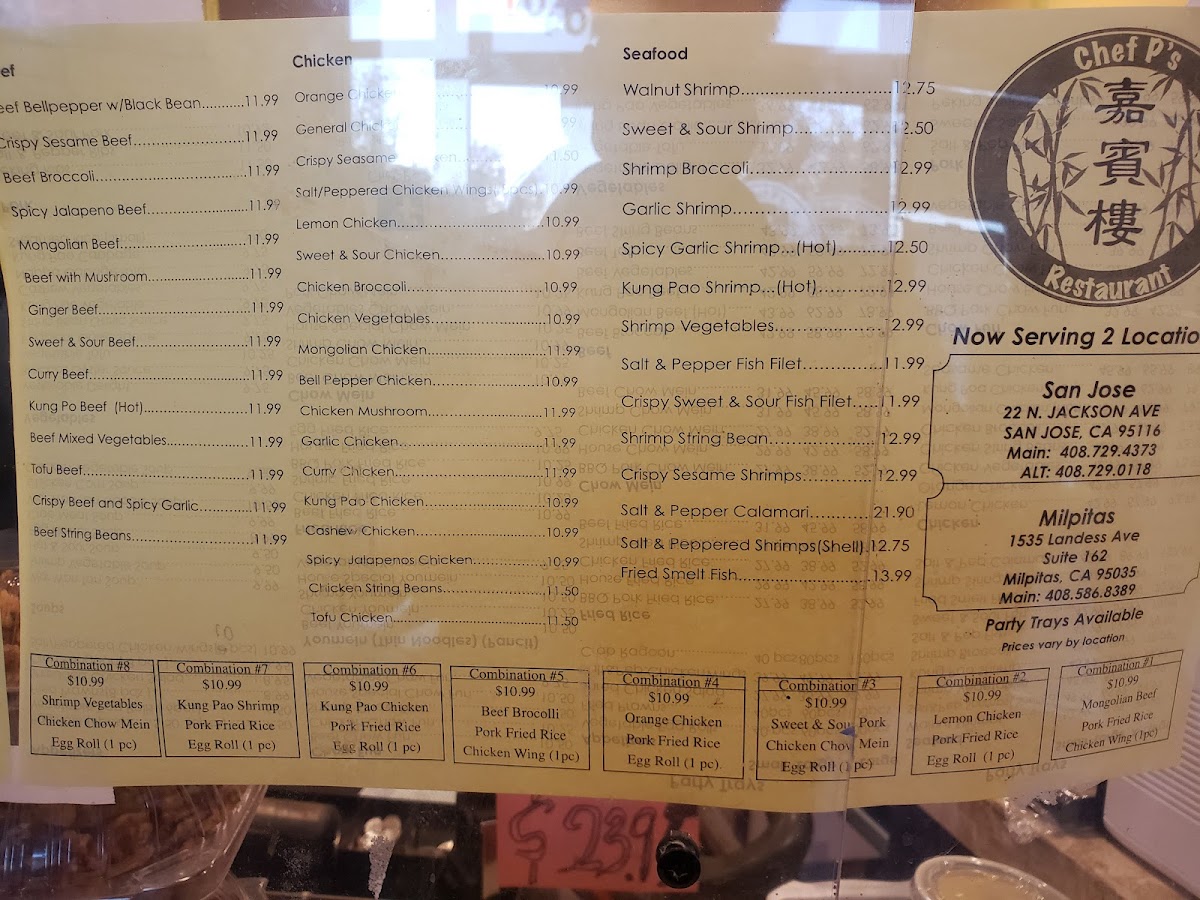 These dishes pair well with the restaurant’s modest atmosphere—often chosen for quick, freshly made meals where the focus is on straightforward, flavorful food rather than an elaborate dining experience. Whether stopping by for a casual dinner or picking up a favorite comfort dish, the menu at Chef P's reflects a reliable and familiar taste of traditional Chinese cuisine.